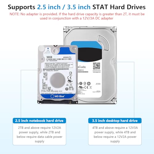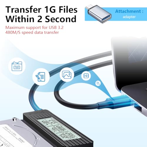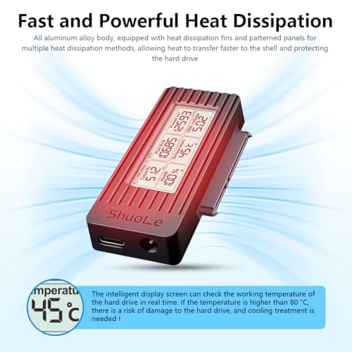 SATA TO USB 3.0 HARD DRIVE READER: Equipped with an integrated LCD monitor, this hard drive reader shows live performance metrics including capacity, operating time, voltage, temperature, power cycles, and overall drive health. It helps identify issues early and ensures consistent data reliability. Note: Adapter not included; for drives over 2TB, use a 12V 3A DC adapter.
